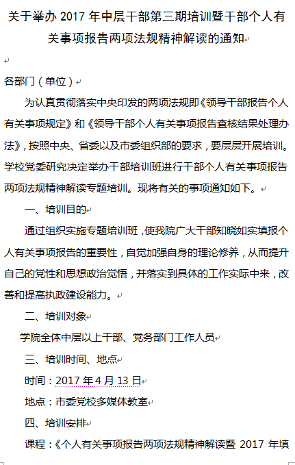 关于举办2017年中层干部第三期培训暨干部个人有关事项报告两项法规精神解读的通知