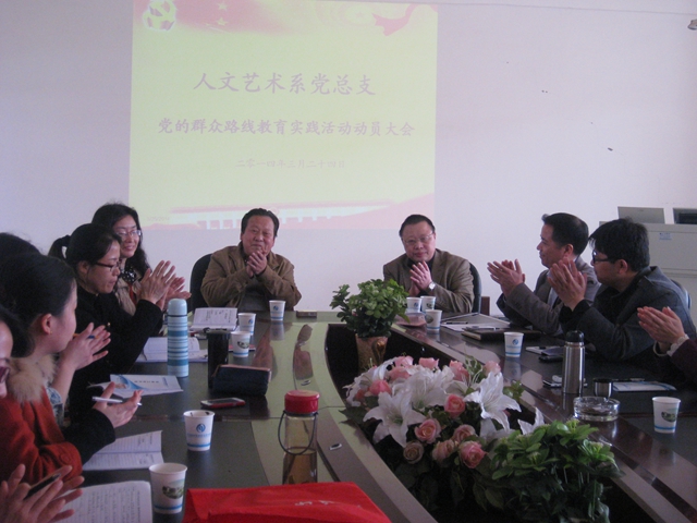 3月25日下午,按照学院关于党的群众路线教育实践活动的部署和要求,人文艺术系党总支在笃行楼B401教室召开了深入开展党的群众路线教育实践活动动员大会,出席会议的有学院副院长贺华、学院党的群众路线教育实践活动督导组成员王建刚主任、系党总支书记兼主任许名勇、党总支副书记彭英姿、副主任蒋畅、各支部书记、系全体教师党员和学生党员代表。会议由副书记彭英姿主持。