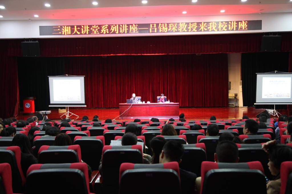 2017年4月11日下午,我校三湘大讲堂系列讲座在学校自强楼音乐厅举行。此次讲学邀请的是中南大学公共管理学院教授、博士生导师、中南大学道学国际传播研究院执行院长、著名学者吕锡琛教授。她以《积善之家必有余庆——传统伦理道德及其现代启示》为题,给全校教职工上了生动的一课。学校党委书记王小平主持讲座,校领导及全体教职工共400余人聆听了讲座。 吕锡琛从忠孝诚信、行善利人、尚和谦让三个方面阐述了中国传统伦理道德中怎样为人处世,怎样与人相处等问题。