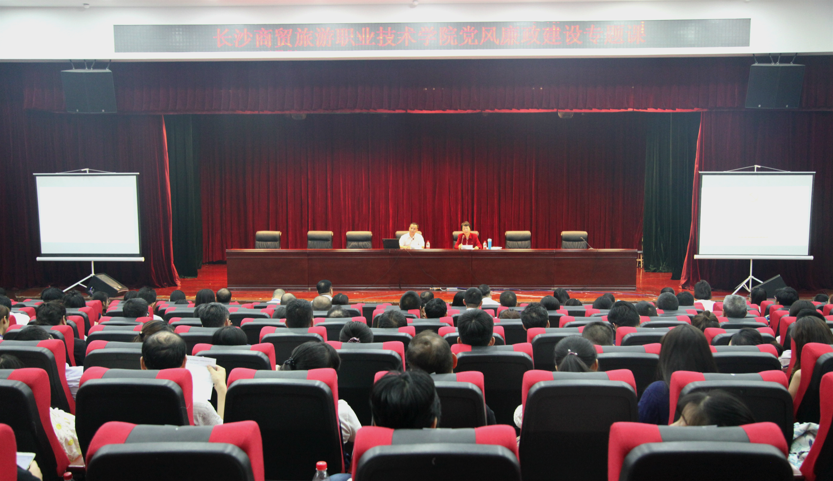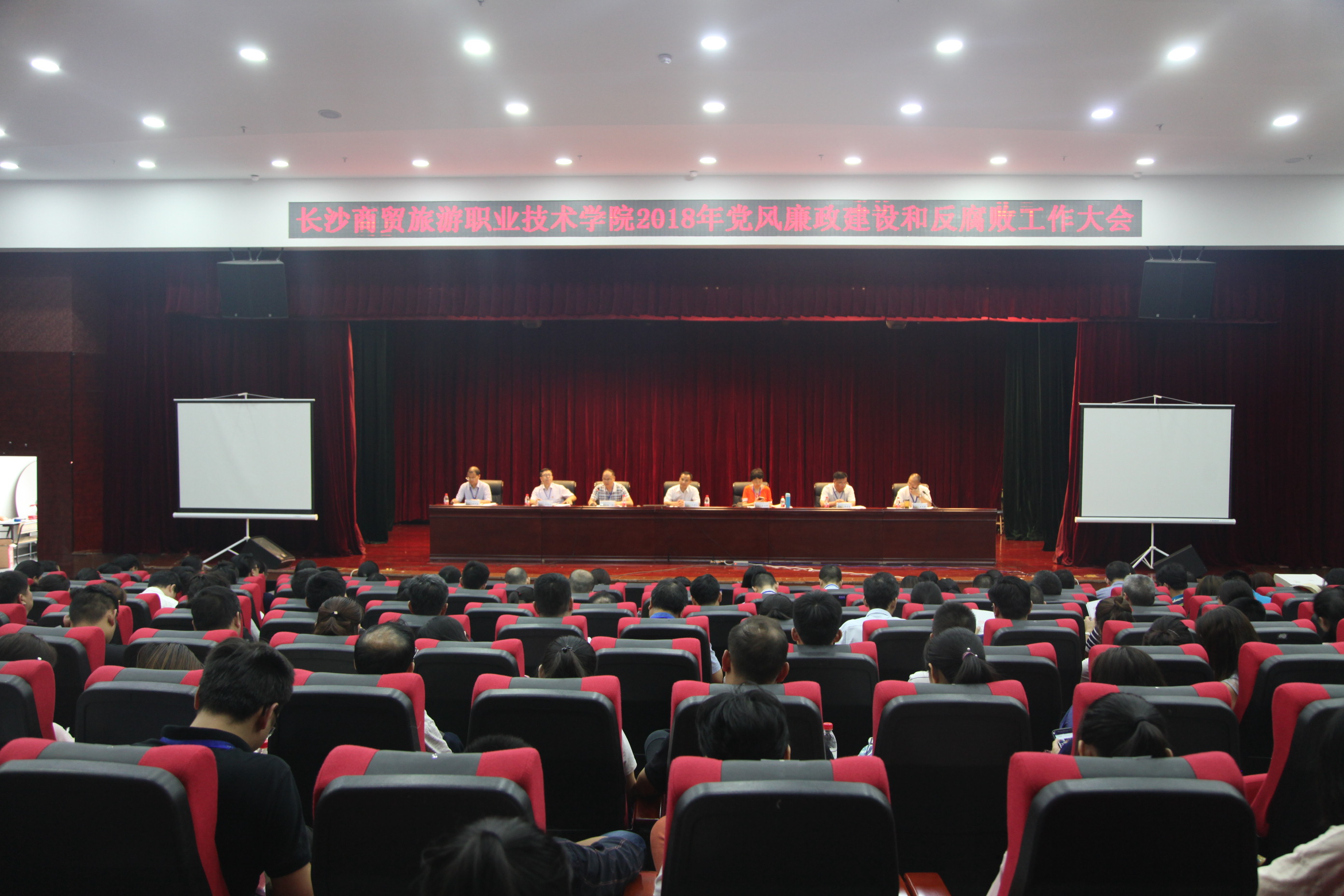 6月12日下午,学校在自强楼音乐厅召开2018年党风廉政建设和反腐败工作大会。省纪委驻省教育厅纪检组第一纪律审查处处长向朝阳出席并在第二阶段作专题党课,党委书记王小平同志出席并讲话,纪委书记金立槟作党风廉政建设和反腐败工作报告,会议由党委副书记李晖同志主持。学校全体校领导、中层干部、教研室主任、全体教职员工党员、学生党员代表参共计330余人参加此次大会。